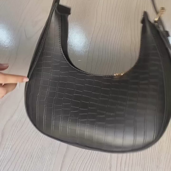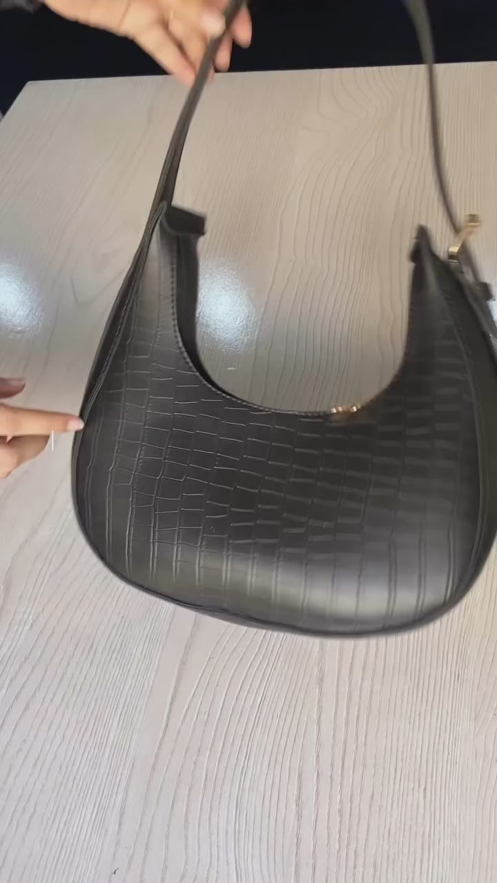 Crafted from high-quality synthetic leather with a premium crocodile print, this sleek moon-shaped design adds a touch of sophistication to any outfit.